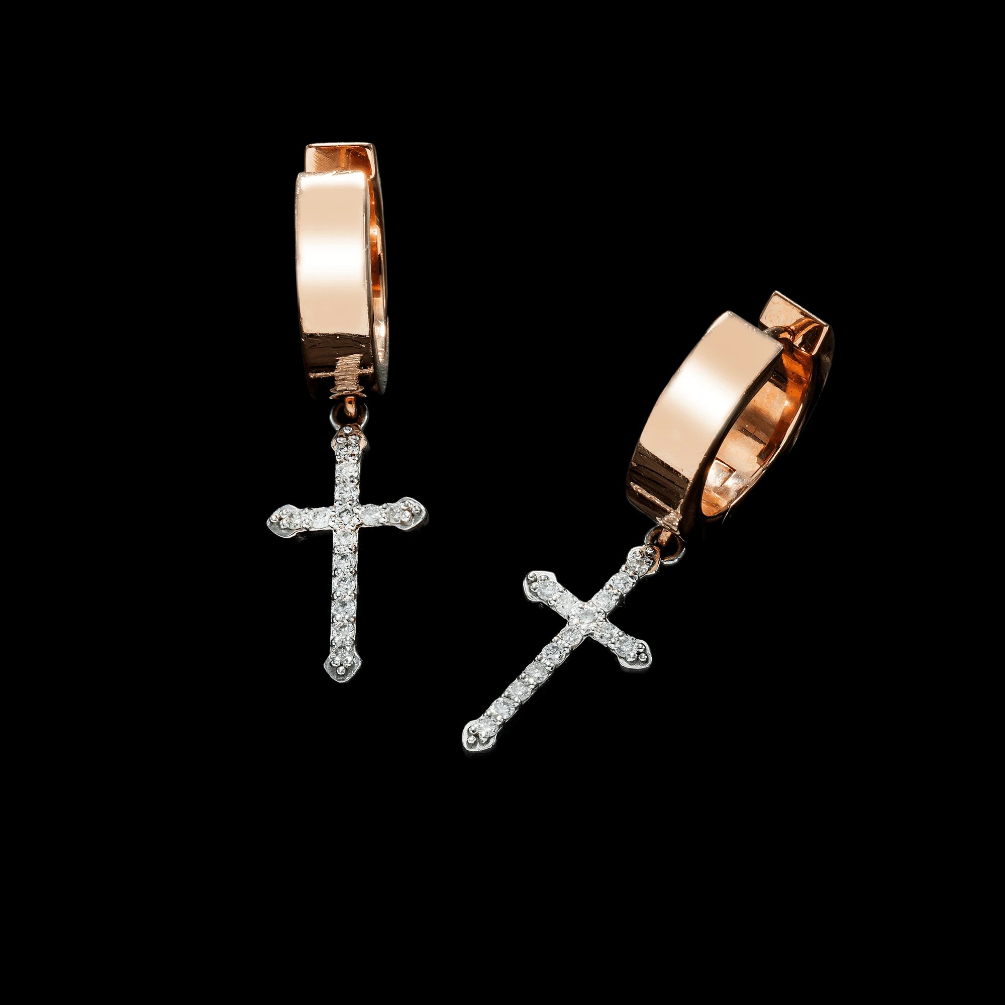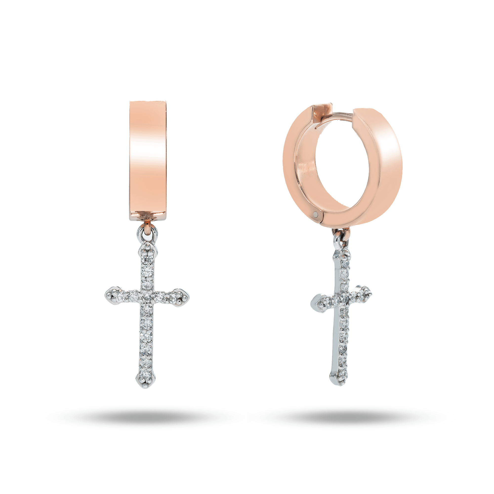 14K Two Tone Gold Cross Dangle Hoops 0.50 ctw. Round Diamond Earrings