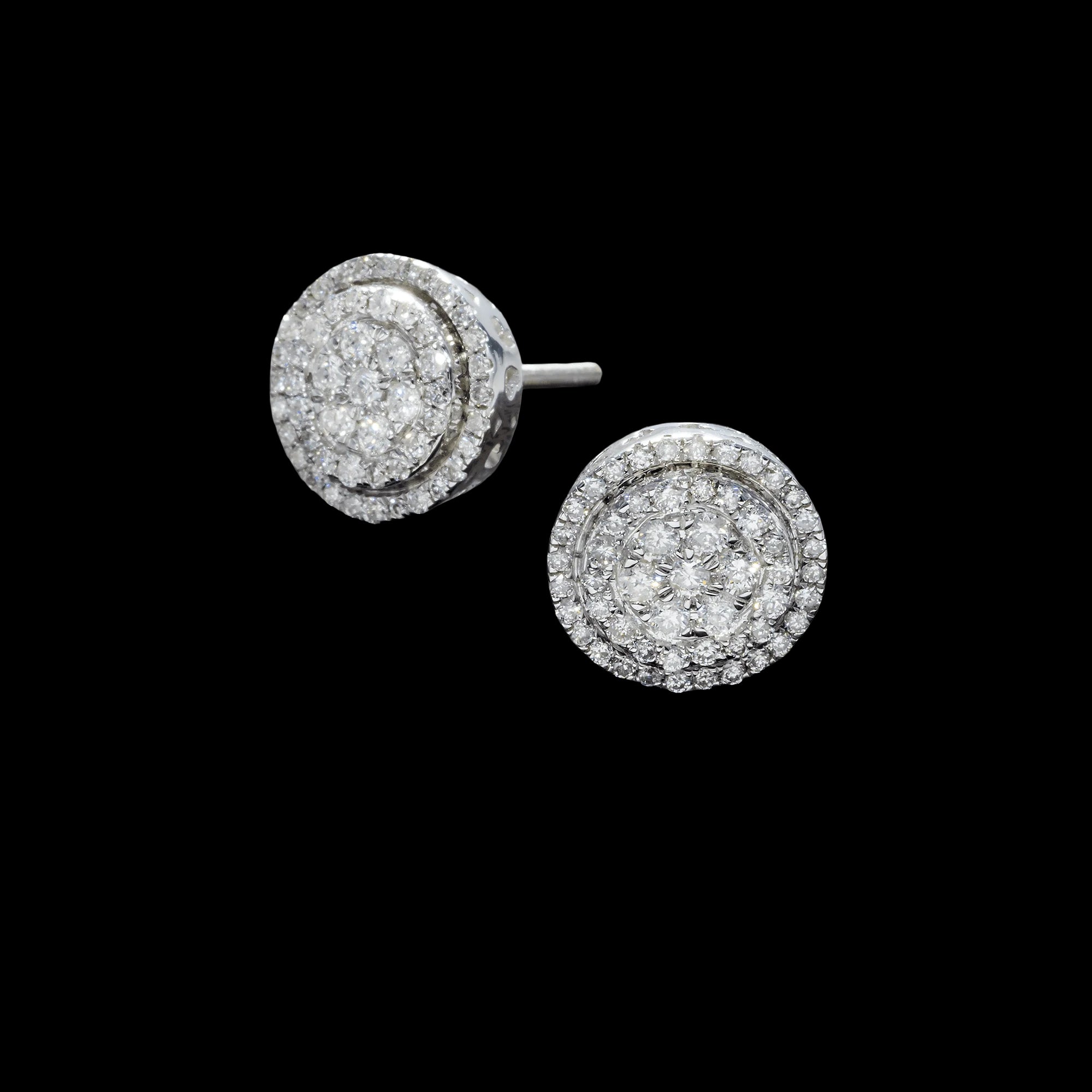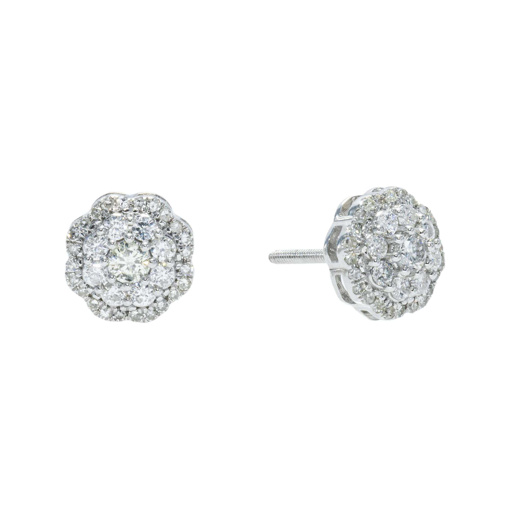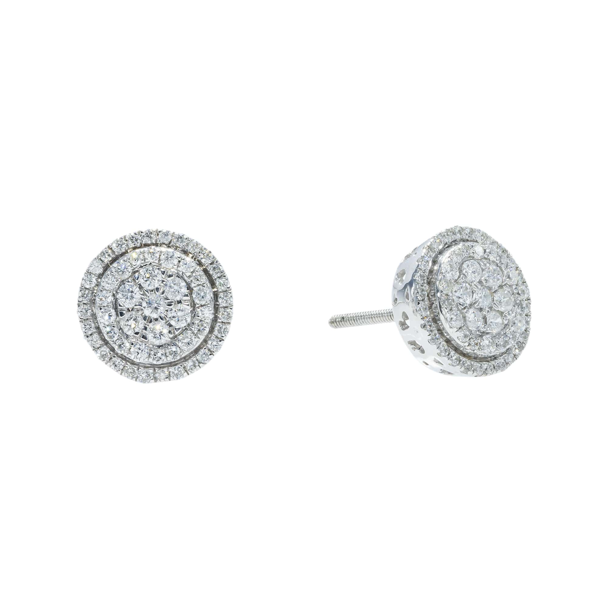 14K White Gold Round Halo Cluster Stud 0.88 ctw. Round Diamond Earrings