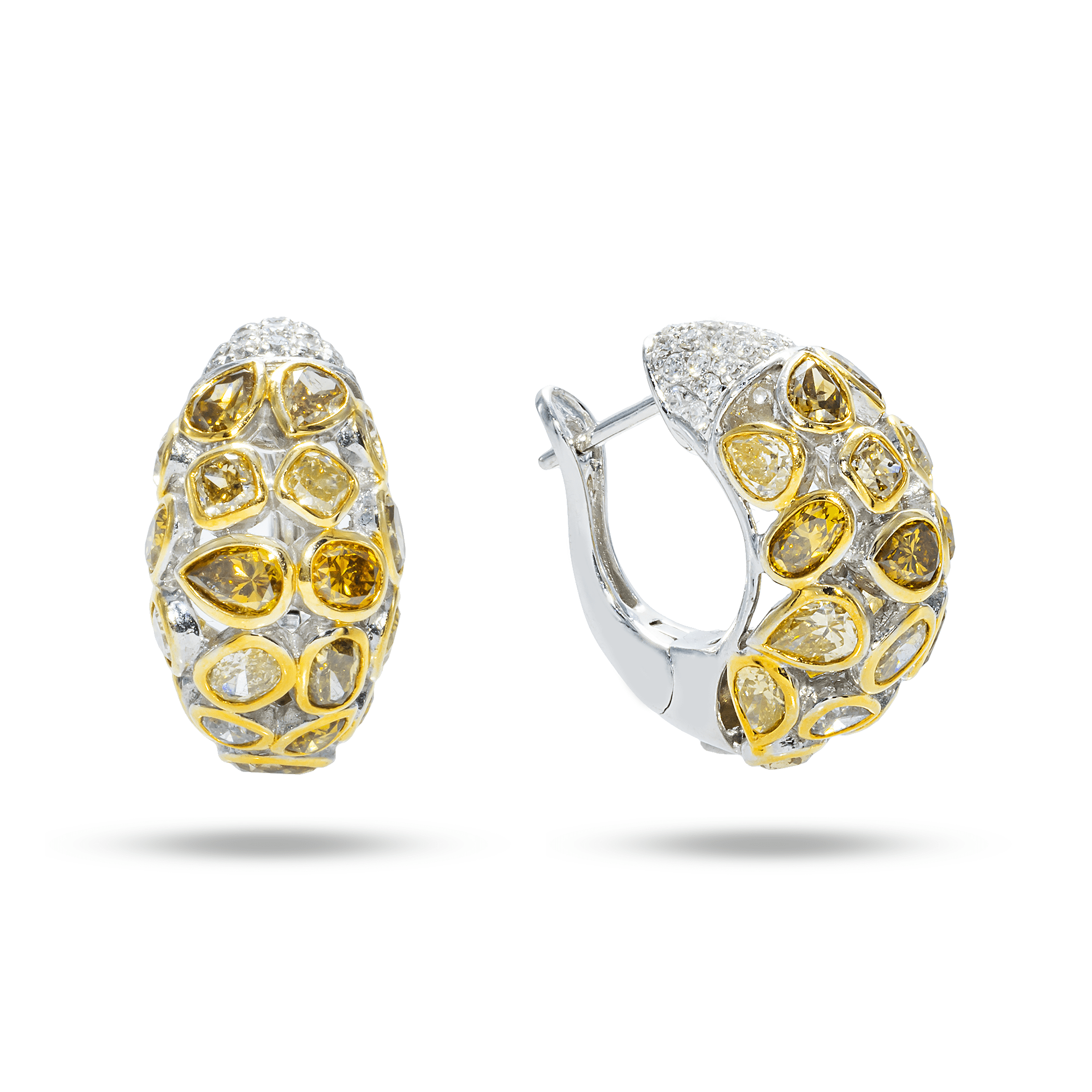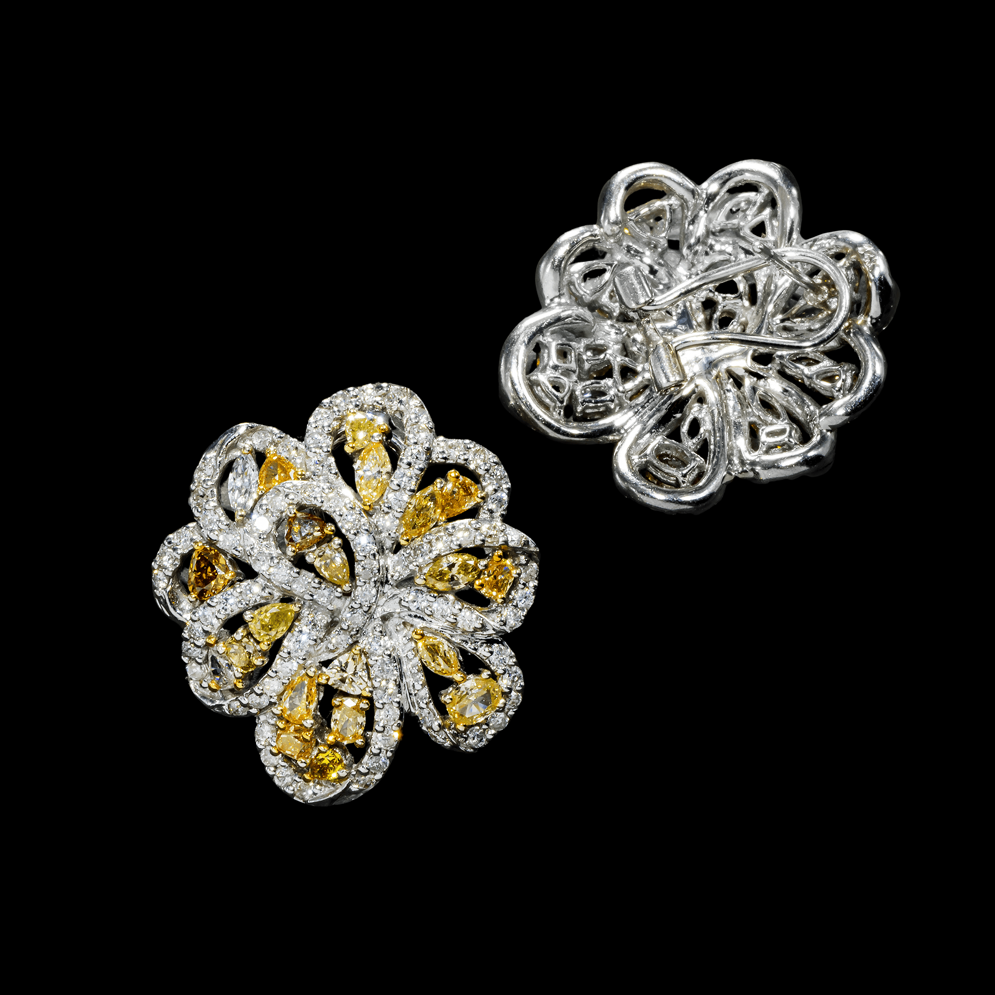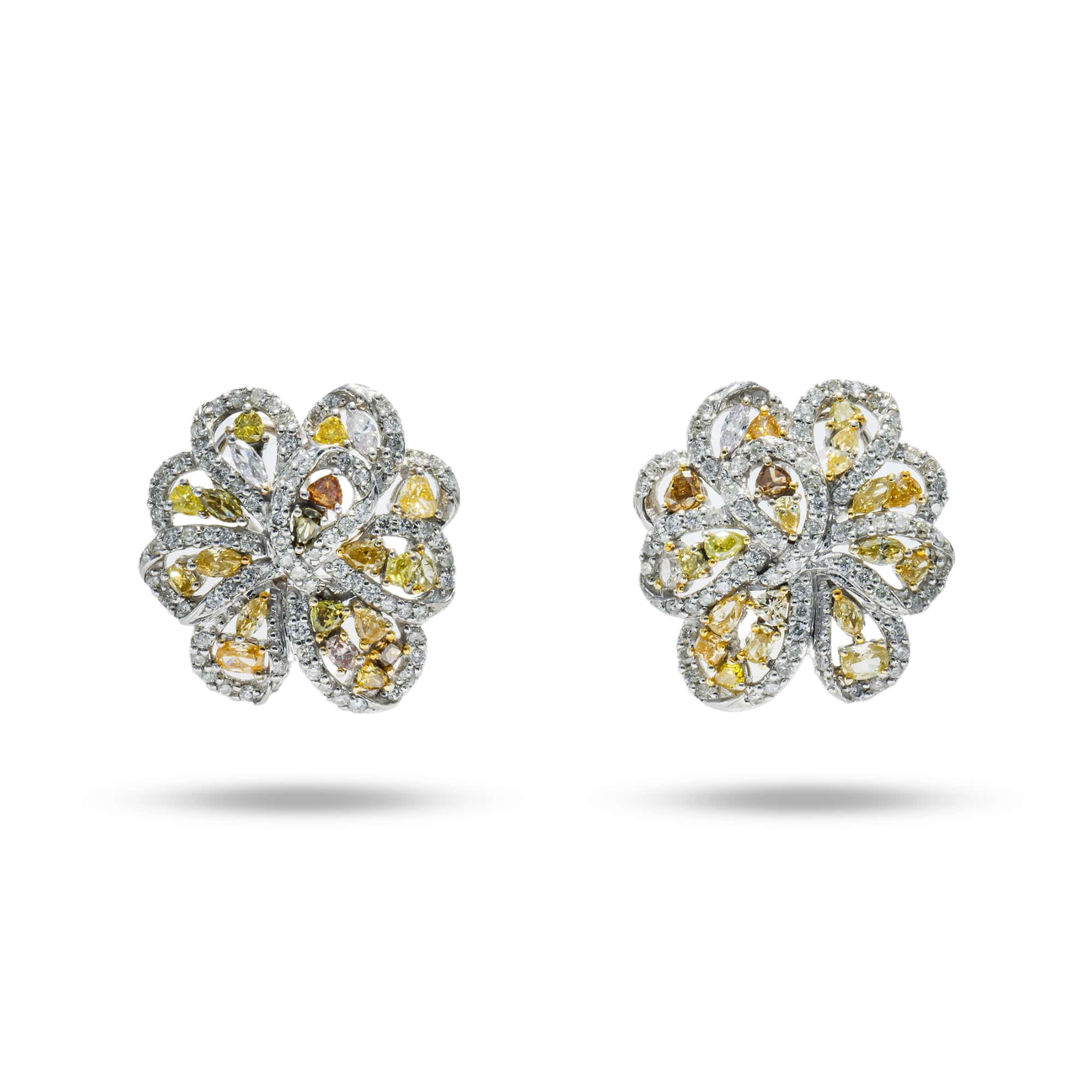 14K White Gold Fancy Yellow Color Brilliant Flower 6.40 ctw. Round Diamond Earrings