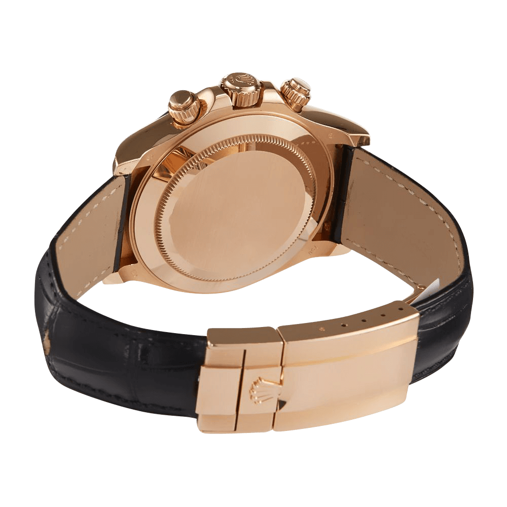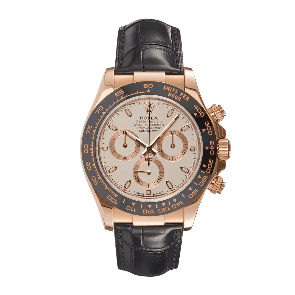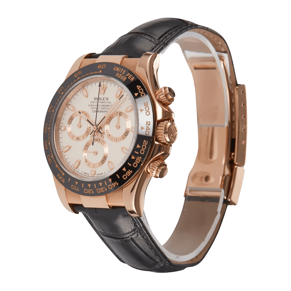 This luxurious timepiece comes with a 40mm rose gold case that has a screw-down case back and winding crown. It has a scratch-resistant sapphire crystal and a monobloc middle case. The Daytona 116515LN has a black monobloc, cerachrom bezel in ceramic with an engraved tachymetric scale. The dial is an eye catching ivory and features three sub-dials; a chronograph, a 30-minute counter and stop seconds which make for precise time setting. Similar to all editions of the Daytona, it is powered by the 4130 caliber that has bidirectional self-winding via Perpetual rotor, a-2/+2 sec/day precision and a 72-hour power reserve. Rolex paired this piece with a leather bracelet that has a rose gold fold over clasp. It has a water resistance of 100 meters (330 feet).