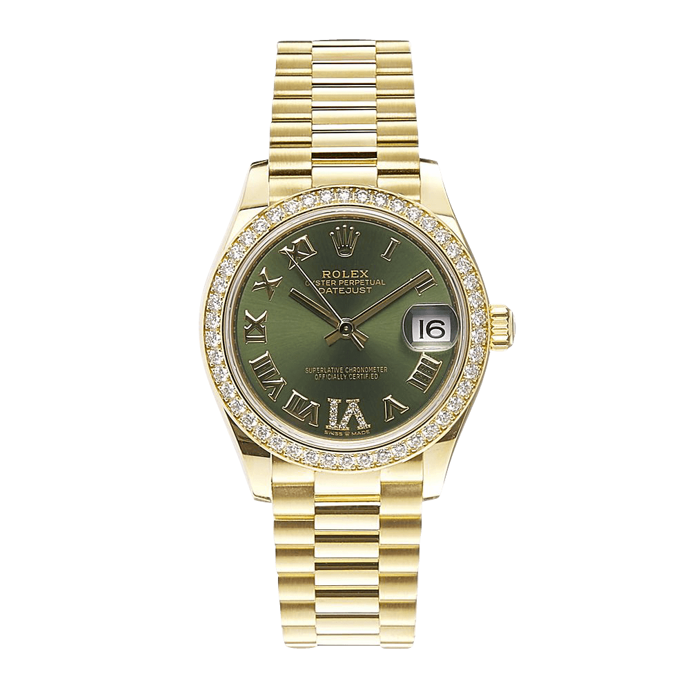 Rolex Datejust 31 - President Gold Factory Diamond Bezel Olive Roman Dial Watch 278288RBR