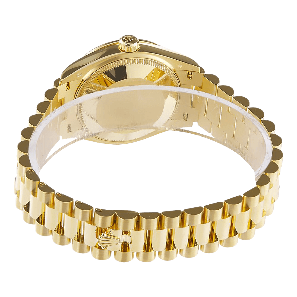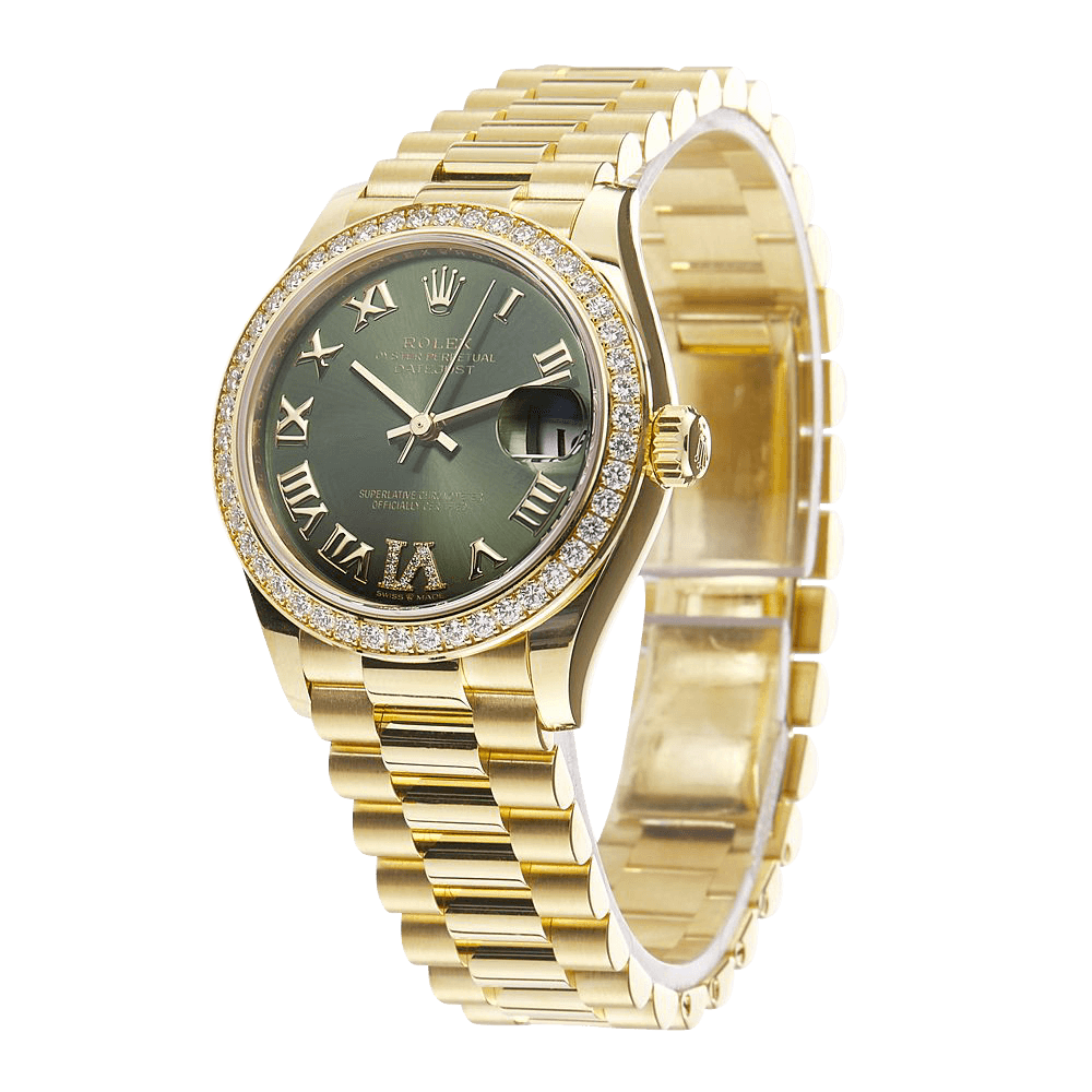 This Oyster Perpetual Datejust 31 in 18 ct yellow gold features an olive green, diamond-set dial and a President bracelet. Its dial features Large VI set with diamonds. The light reflections on the case sides and lugs highlight the elegant profile of the 31 mm Oyster case, which is fitted with a diamond-set bezel. Aesthetically, the Datejust has spanned eras, while retaining the enduring codes that make it, notably in its traditional versions, one of the most recognized and recognizable of watches. Powered by the 2236 caliber, the Datejust 31 features a power reserve of 55 hours and is water resistant up to 100 meters or 330 feet.