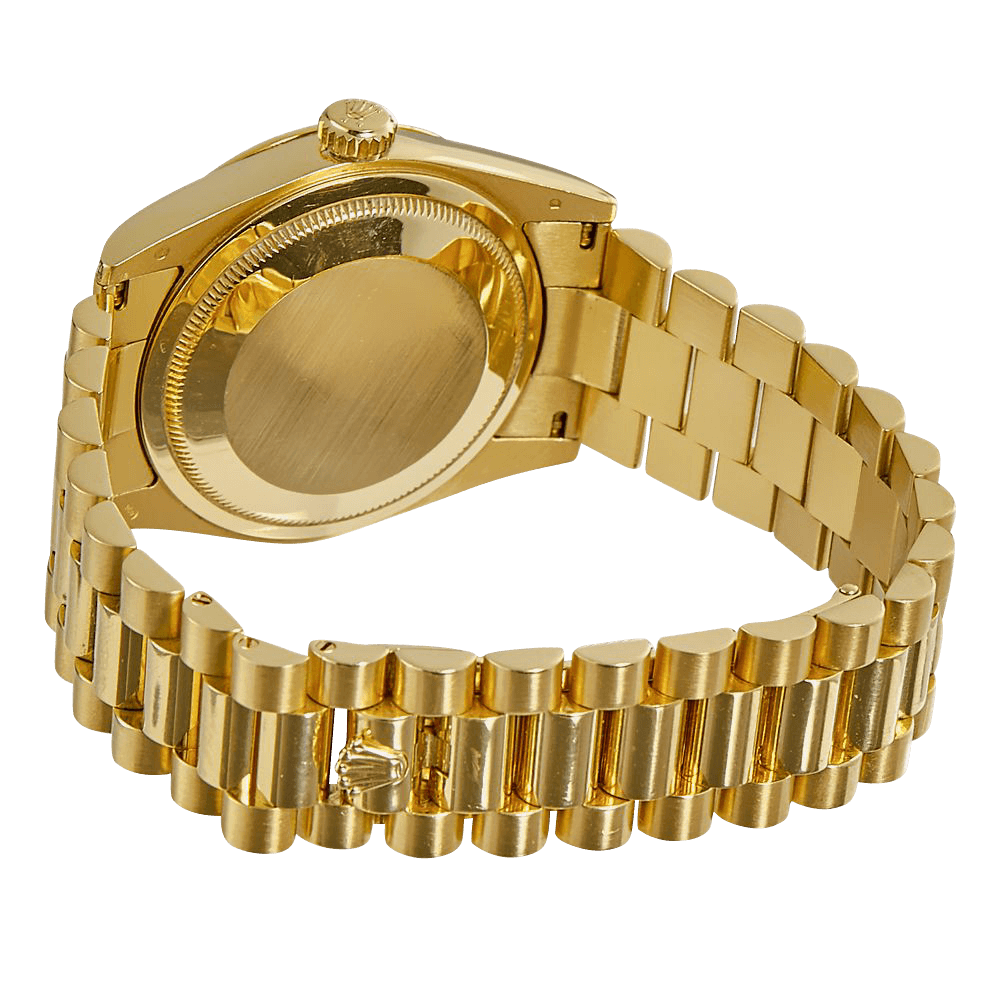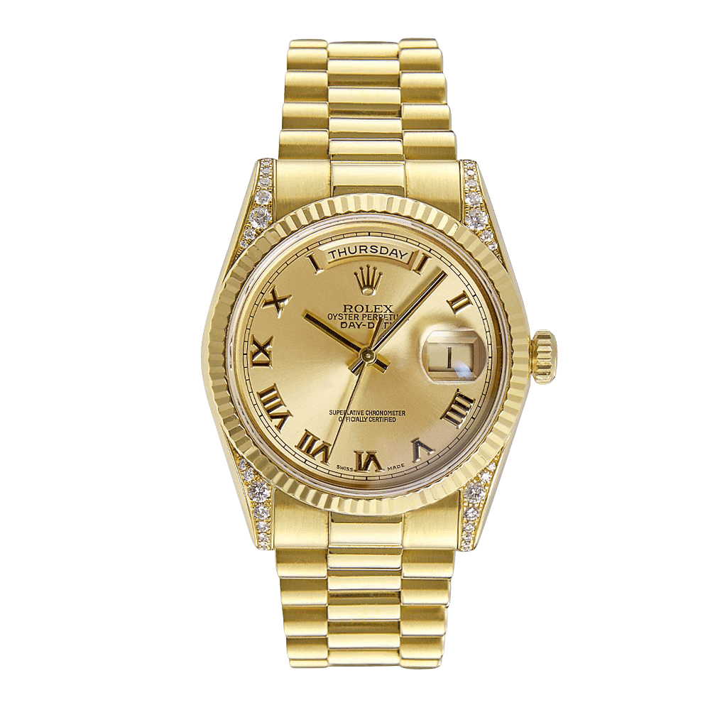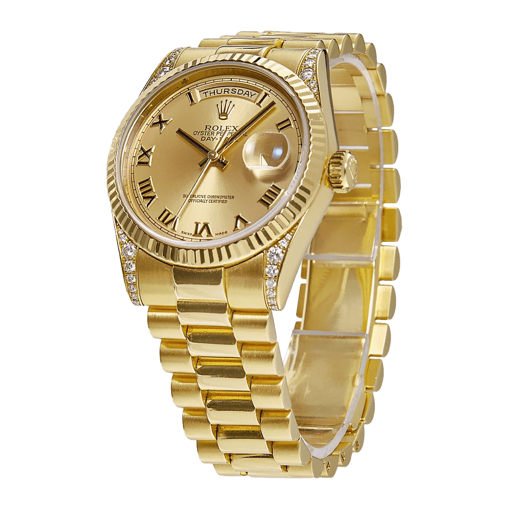 Upgrade your luxury watch collection with the all-gold 118338 Day-Date that features diamond hour markers. This 118338 has a 36mm case made of yellow gold and has a scratch-resistant sapphire crystal with a solid screw down crown. Round diamonds are fitted on the lugs for an extra touch of luxury. It has a fluted yellow gold bezel for an extra taste of elegance. The dial is champagne colored and features roman hour markers, a day window is at 12 o-clock and a date window is at 3-o-clock. The 118338 is powered by the self-winding 3155 caliber a certified Swiss chronometer that has day-date functionality and a power reserve of 48 hours. The luxurious case is fitted on a yellow gold president bracelet with a concealed fold-over crownclasp closure. It has a water resistance of 100 meters (330 feet).