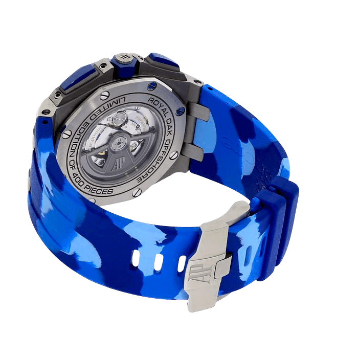 Audemars delivers a luxurious take on what camouflage accessories can be with 26400SO.OO.A055CA.01 army green boutique edition watch. The 26400SO.OO.A055CA.01 has a stainless-steel case that is 44mm in diameter and 14.4mm thick with a glareproof sapphire crystal, a fixed khaki ceramic bezel, a screw locked crown and an exhibition case back. The dial is khaki green with rhodium-toned counters, white gold applied hour markers and hands, a date window and a black inner bezel. The 26400SO.OO.A055CA.01 is powered by the 3126 AP caliber which has chronograph and date functionality and a power reserve of 50 hours. The case is paired with a khaki green camouflage rubber strap that has a stainless-steel pin buckle. It has a water resistance of 100 meters (330 feet) The 26400SO.OO.A055CA.01 is a limited edition boutique timepiece of 400 pieces that all rare watch collectors need to have.