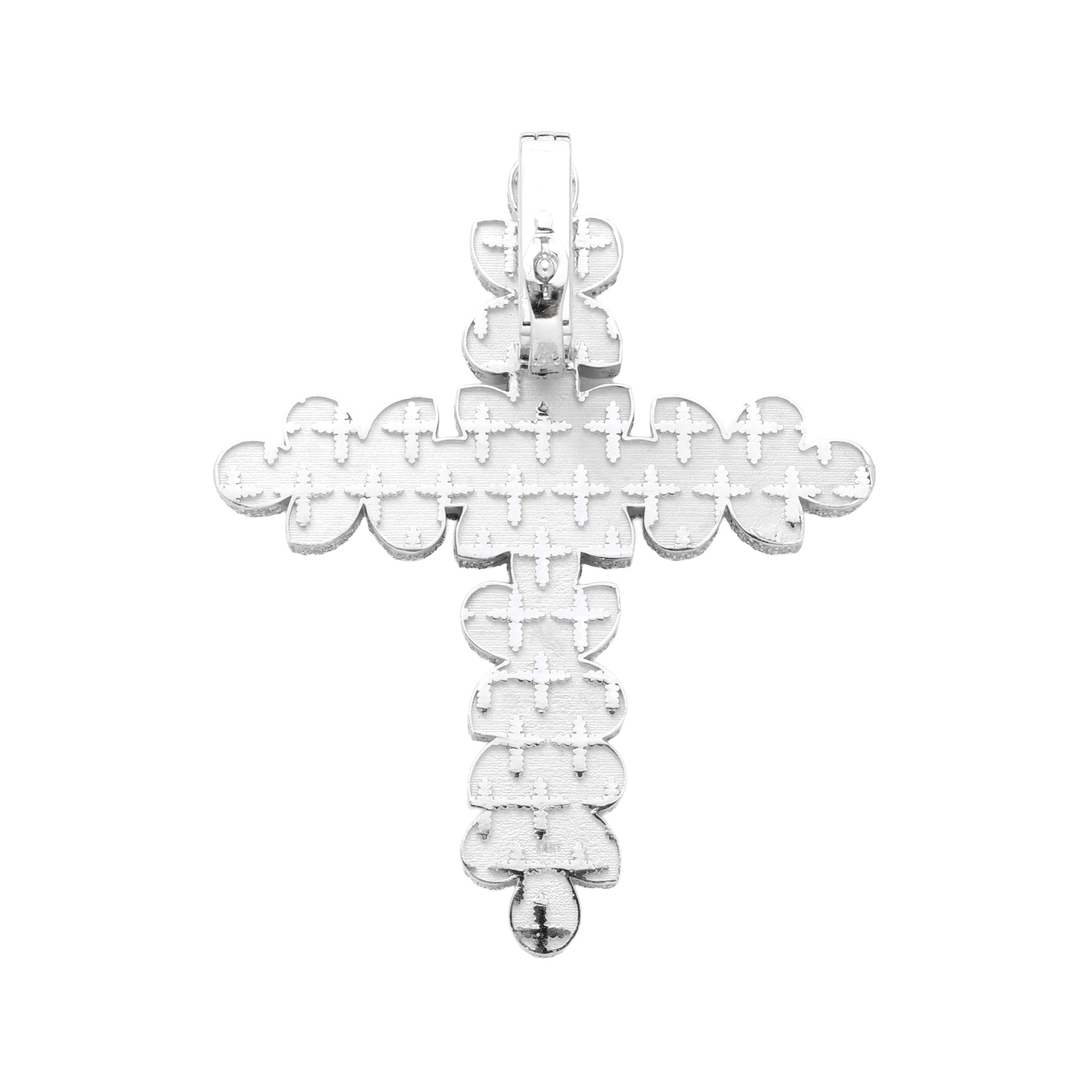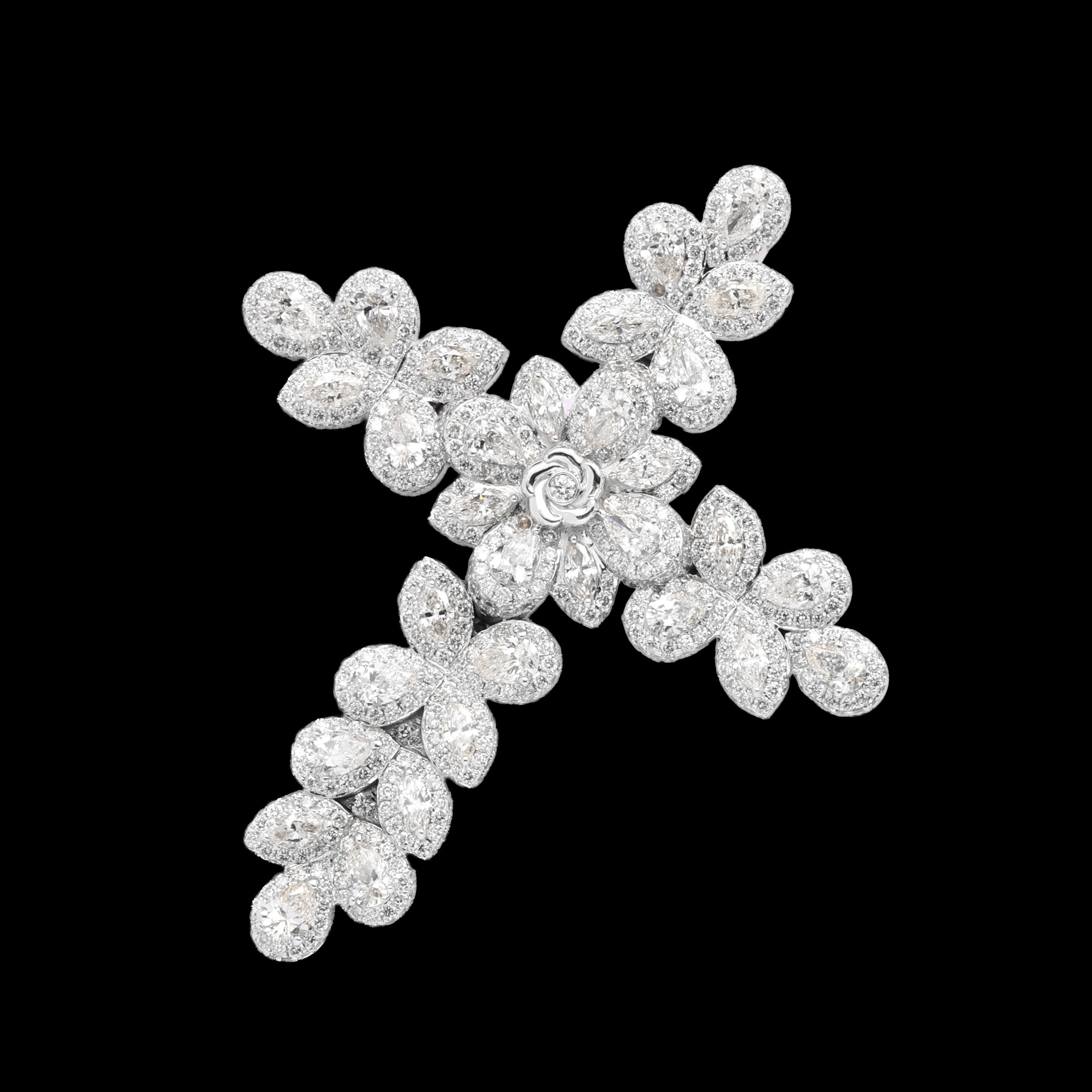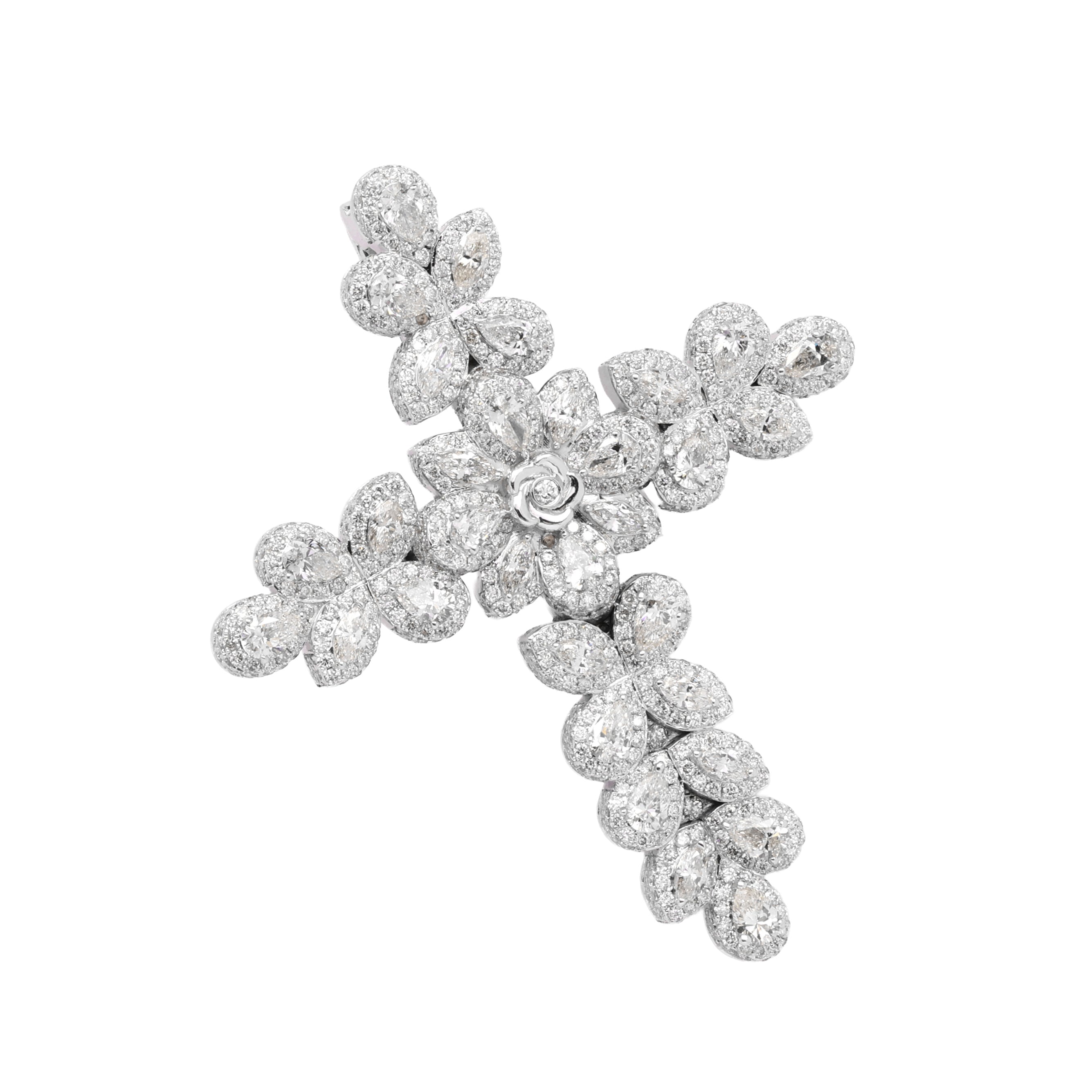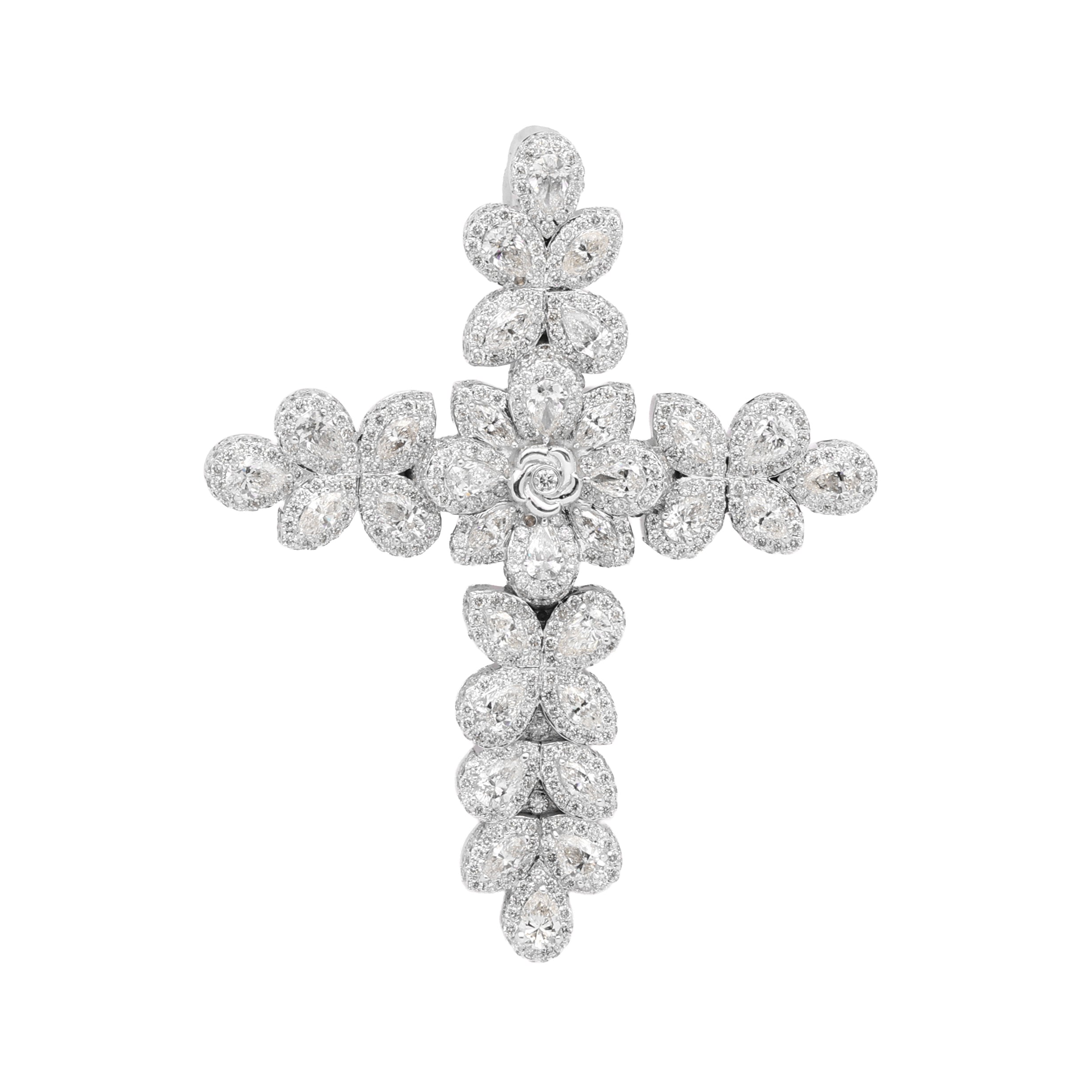 14k White Gold Flower Cross Pendant | 7.10 Carat Pear-Cut & Round-Cut Diamond