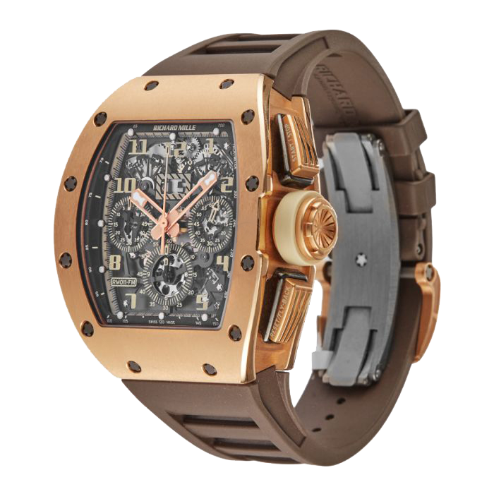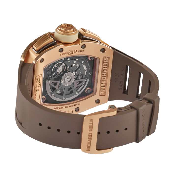 Richard Mille combined the beauty of animalistic ivory with luxurious rose gold for an RM011 that no one can resist. This RM-011 features a rose gold, tonneau case that is 49.94 x 44.50 mm in dimension and comes assembled with 20 grade 5 titanium spline screws and abrasion-resistant washers in 316L stainless steel. The dial is skeletonized with ivory-toned sub-dials and numerals as well as rose gold hands. The RM011 runs on the RMAC1 Caliber which has automatic winding movement with adjustable rotor geometry and a 50-hour limit power reserve. The RMAC1 Caliber offers hours, minutes, seconds, flyback chronograph, 60-minute countdown timer, 12-hour totalizer, oversize date, and month. The transparent dial is skeletonized with Arabic numerals. This RM011 is paired with a brown rubber bracelet featuring a titanium fold-over clasp. It has a water resistance of 50 meters (164 feet).