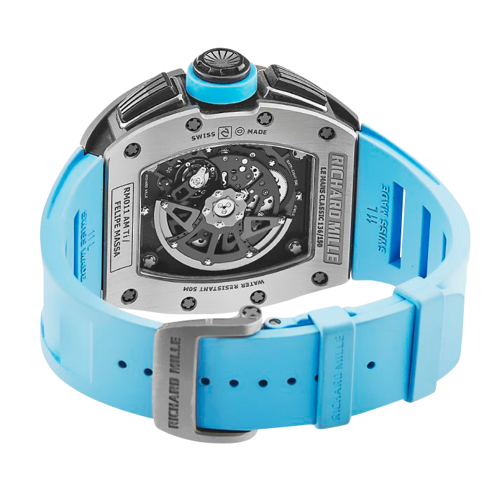 Limited to 150 pieces world wide. In 2007, Richard Mille released a new watch developed in collaboration with Felipe Massa. The RM 011, named after the eponymous F1 driver, takes its cues from the high-tech precision engineering of F1 racing cars developed to deliver exceptional performance on the track. This limited time piece is housed on a rubber strap and features the typical RM details including a tonneau shaped carbon case with titanium bezel. The dial is skeletonized and is driven by a movement unlike any other. The RMAC1 calibre is an automatic chronograph equipped with a variable-geometry rotor. The flyback chronograph function can reset without stopping and offers a countdown function. It also features an annual calendar with oversize date. Water resistant up to 50 meters or 165 feet.