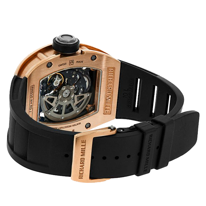 Deriving inspiration from previous Richard Mille tourbillon models RM010 was created to highlight svelte design and technical advancement that all Richard Mille fans adore. The RM010 comes with a rose gold tonneau case. It's powered by the RMAS7 Caliber, which has a skeletonized automatic movement with date functionality and a power reserve of 55 hours. The skeletonized dial displays a rotor that runs on variable geometry made of grade 5 titanium, which allows for resistance to abrasions. It comes with a sapphire crystal, grade 5 titanium screws, and an interior flange in black carbon fiber. The RM 010 comes with black leather that has a fold-over clasp. It has a water resistance of 50 meters (196 feet).