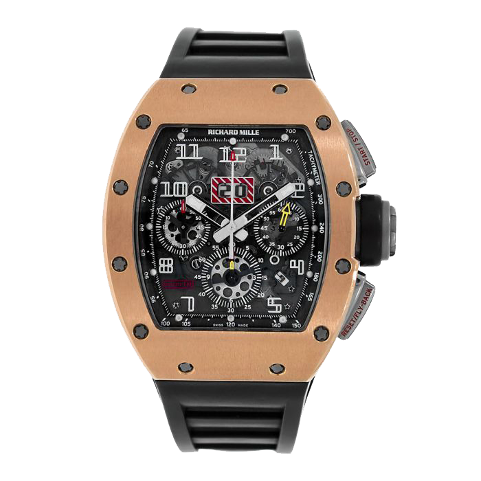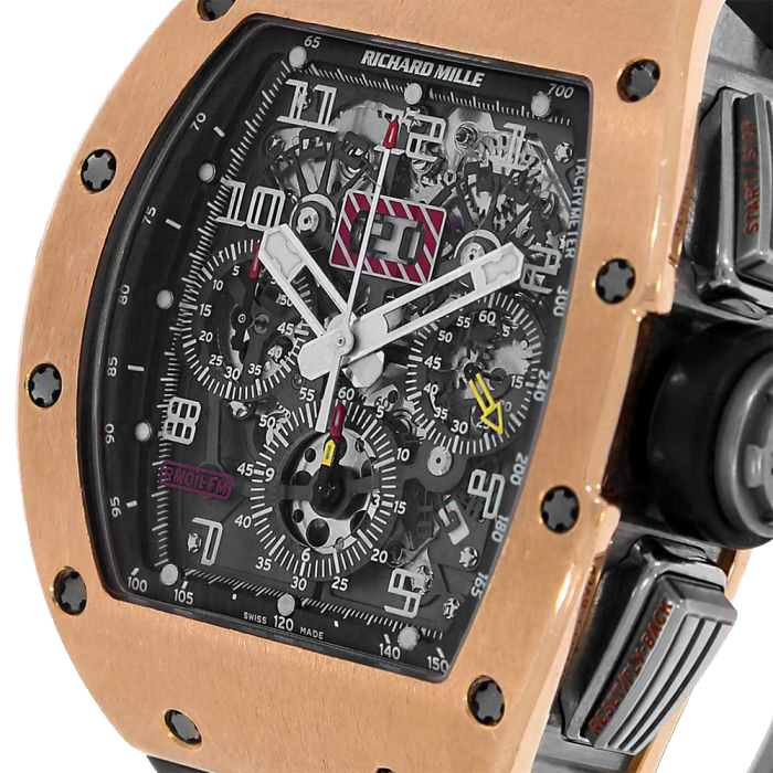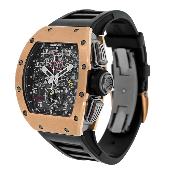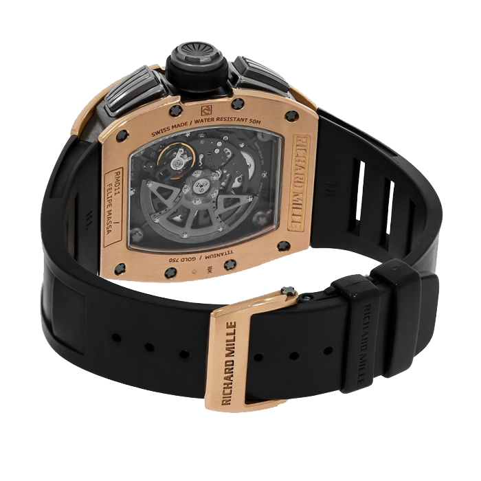 Add some strength to your watch collection with the Felipe Massa Chronograph from Richard Mille. It features a titanium, tonneau case that has 49.94 x 44.50 mm dimensions with a rose gold bezel and comes assembled with 20 grade 5 titanium spline screws and abrasion resistant washers in 316L stainless steel. The RM011 runs on the RMAC1 Calibre which has automatic winding movement with adjustable rotor geometry and a 50-hour limit power reserve. The RMAC1 Calibre offers hours, minutes, seconds, flyback chronograph, 60-minute countdown timer, 12-hour totalizer, oversize date and month. The transparent dial is skeletonized with Arabic numerals. This RM011 is paired with a black rubber bracelet featuring a titanium fold-over clasp. It has a water resistance of 50 meters (164 feet).