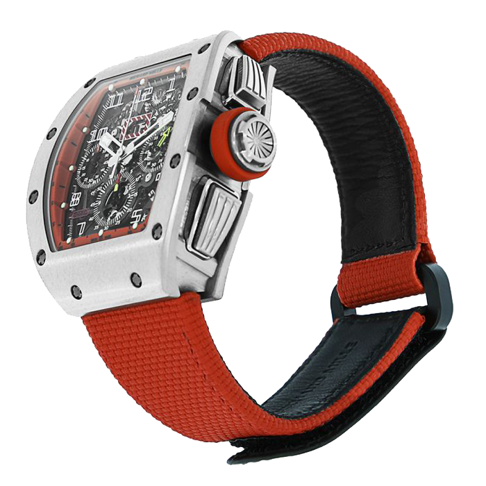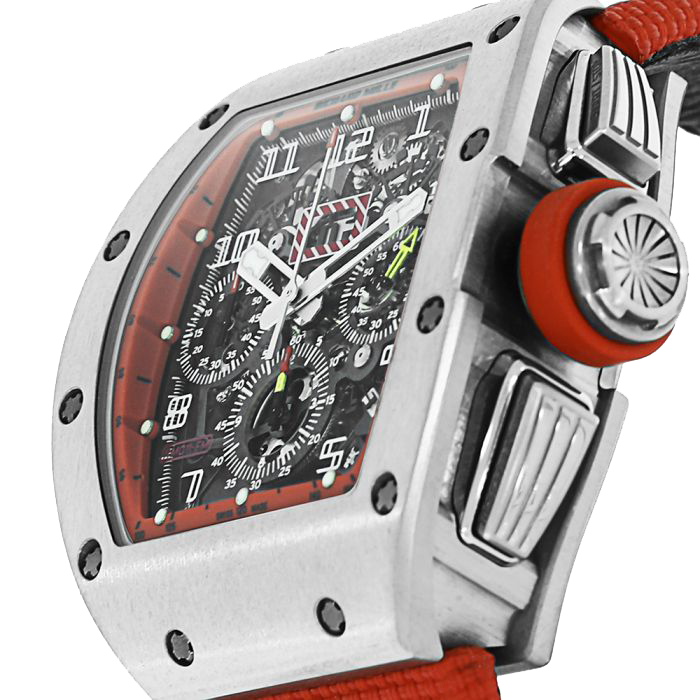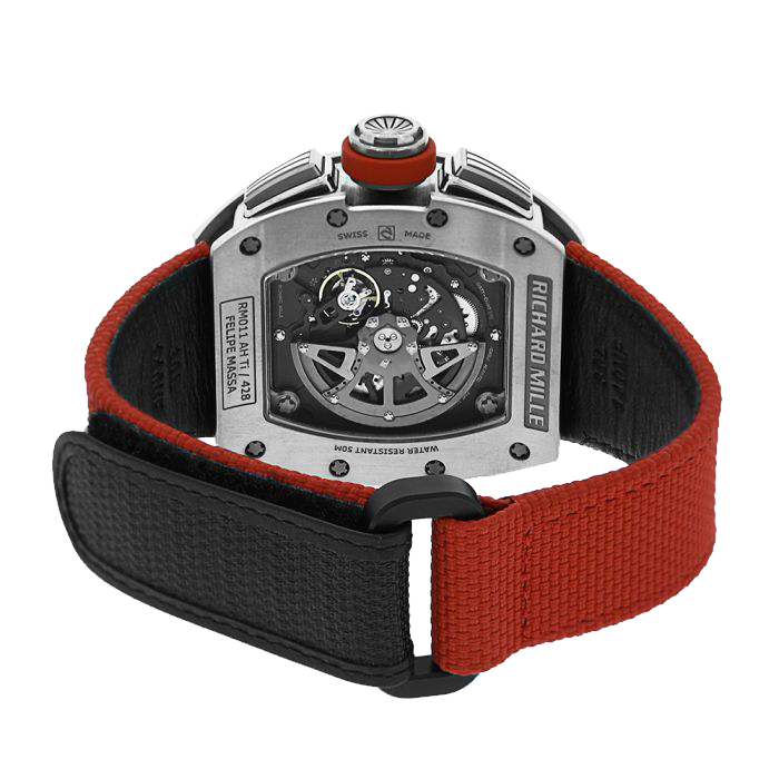 Add some strength to your watch collection with the Felipe Massa Titanium Chronograph from Richard Mille. It features a titanium, tonneau case. The RM011 runs on the RMAC1 Caliber which has automatic winding movement with adjustable rotor geometry and a 50-hour limit power reserve. The RMAC1 Caliber offers hours, minutes, seconds, flyback chronograph, 60-minute countdown timer, 12-hour totalizer, oversize date and month. The transparent dial is skeletonized with Arabic numerals. This RM011 is paired with a red fabric strap and features a Velcro closure. It has a water resistance of 50 meters (164 feet).