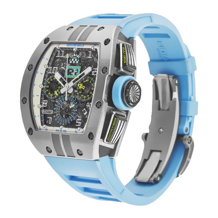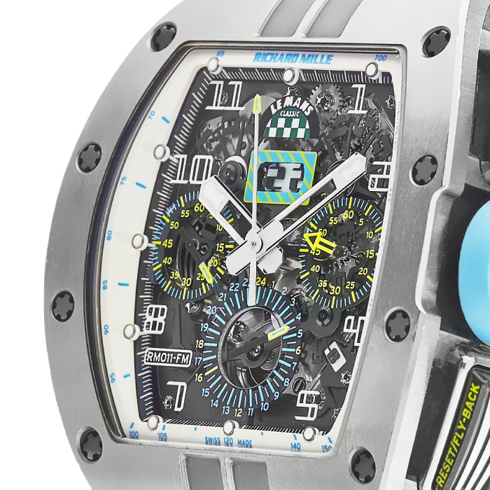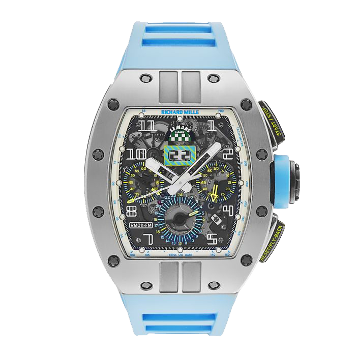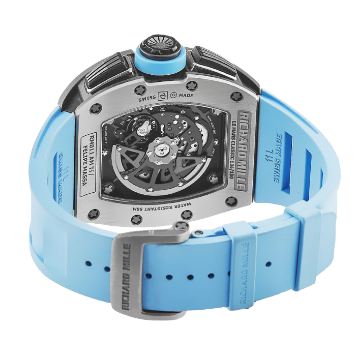 Limited to 150 pieces world wide. In 2007, Richard Mille released a new watch developed in collaboration with Felipe Massa. The RM 011, named after the eponymous F1 driver, takes its cues from the high-tech precision engineering of F1 racing cars developed to deliver exceptional performance on the track. This limited time piece is housed on a rubber strap and features the typical RM details including a tonneau shaped carbon case with titanium bezel. The dial is skeletonized and is driven by a movement unlike any other. The RMAC1 calibre is an automatic chronograph equipped with a variable-geometry rotor. The flyback chronograph function can reset without stopping and offers a countdown function. It also features an annual calendar with oversize date. Water resistant up to 50 meters or 165 feet.