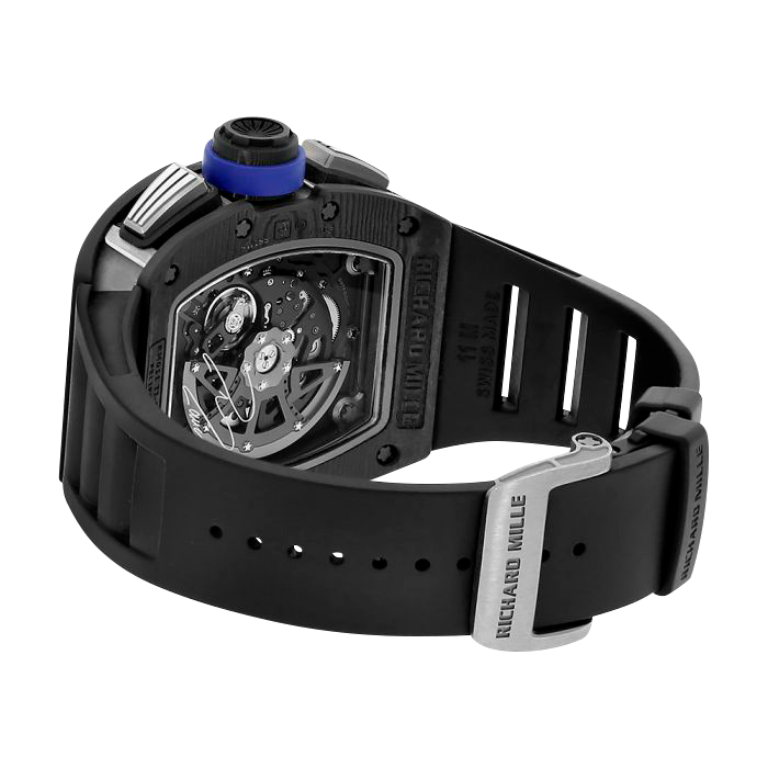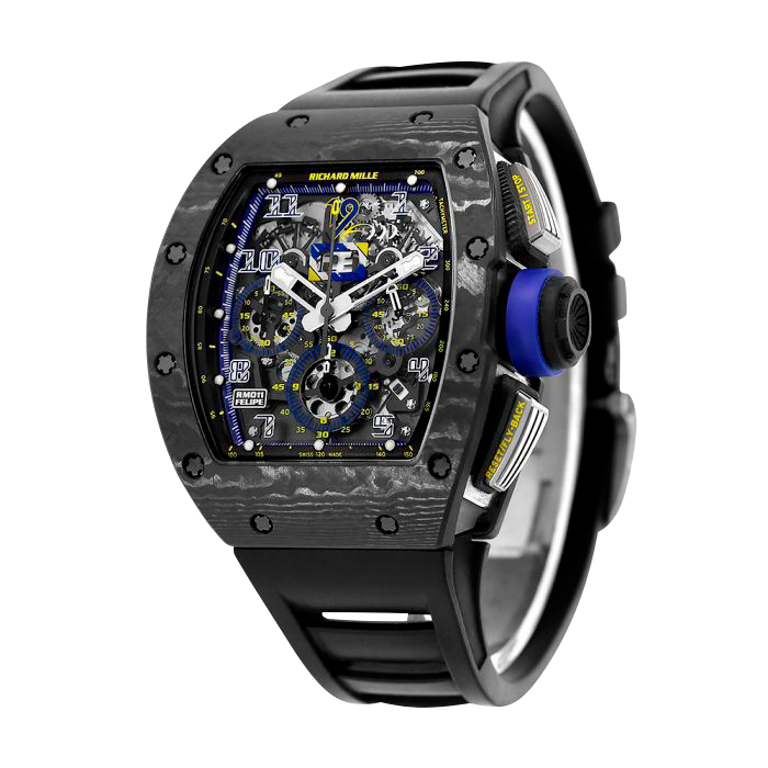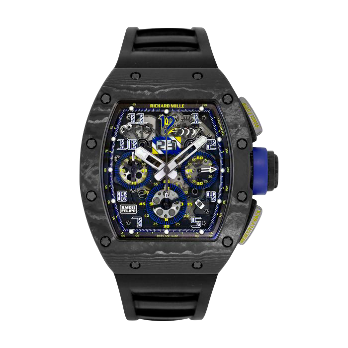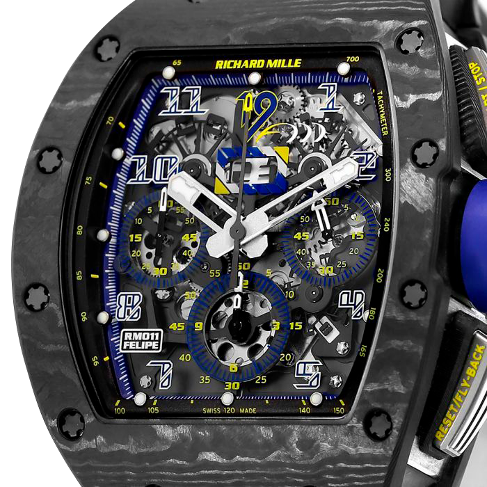 To celebrate the successful 10-year collaboration between Richard Mille and Felipe Massa, a collection of limited-edition watches were released. This included the 10th anniversary RM011 which featured the Felipe Massa colors of yellow and blue, his signature logo on the dial and his reproduced signature on the exhibition case back. The anniversary edition of the RM 011 comes in a tonneau shaped case that is 50 x 40mm in surface area and 16.15mm thick with a titanium case band and a fixed carbon NTPT bezel. The dial is skeletonized with blue-white Arabic numerals, three sub-dials, a date and month window plus an inner tachymeter bezel. This RM011 is powered by the RMAC1 Calibre which has automatic winding movement with adjustable rotor geometry and a 50-hour limit power reserve. The RMAC1 Calibre offers hours, minutes, seconds, flyback chronograph, 60-minute countdown timer, 12-hour totalizer, oversize date and month functionality. The brilliant case is paired with a rubber bracelet with a titanium double fold over closure. It has a water resistance of 100 meters (330 feet).