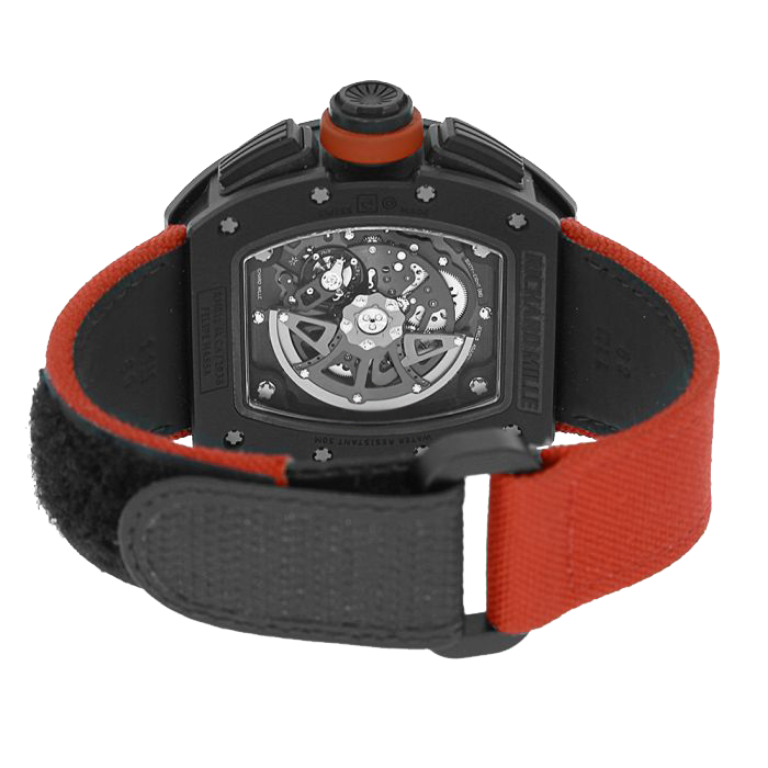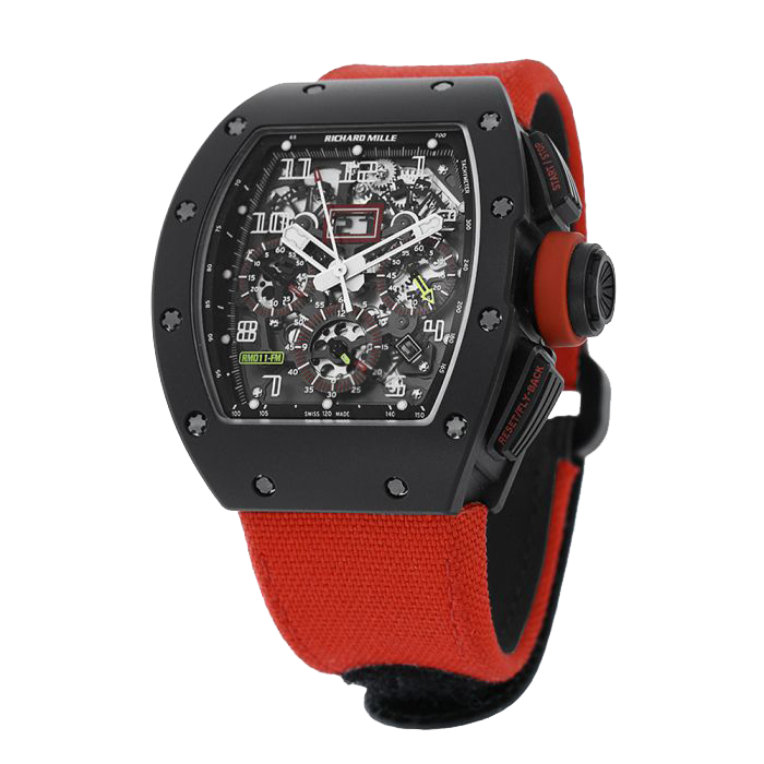 Add some strength to your watch collection with the Felipe Massa Carbon Chronograph from Richard Mille. It features a Carbon, tonneau case. The RM011 runs on the RMAC1 Caliber which has automatic winding movement with adjustable rotor geometry and a 50-hour limit power reserve. The RMAC1 Caliber offers hours, minutes, seconds, flyback chronograph, 60-minute countdown timer, 12-hour totalizer, oversize date and month. The transparent dial is skeletonized with Arabic numerals. This RM011 is paired with a red fabric bracelet and features a Velcro closure. It has a water resistance of 50 meters (164 feet).