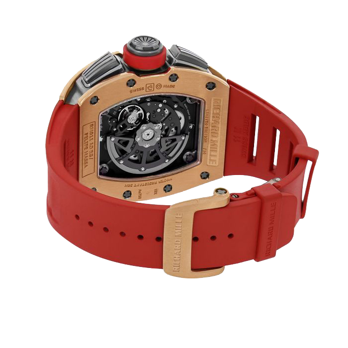 Take a different spin on what a demon can truly be when you own the Red Demon edition of the RM 011. It comes with a titanium, tonneau case with a rose gold bezel that measures 50mm x 42.7mm and is 13.95mm thick. The transparent dial features an anti-reflective sapphire crystal and case back and displays three sub-dials and a 12 oclock placed date feature. The entire case is fitted in scarlet red and black from the inner bezel to the sub-dials and everything in between. The visually striking case is fitted with a titanium caseband and crown, along with pushers set in NTPT carbon. It is powered by the RMAR1 Caliber that has skeletonized automatic movement with date functionality and a power reserve of up to 55 hours. this innovative watch comes with a declutchable rotor, that prevents the buildup of harmful debris inside the winding barrel and has a power reserve of up to 55 hours. It has a water resistance of 50 meters (164 feet). Only 30 pieces of the red demon edition were created so get yours while you can.