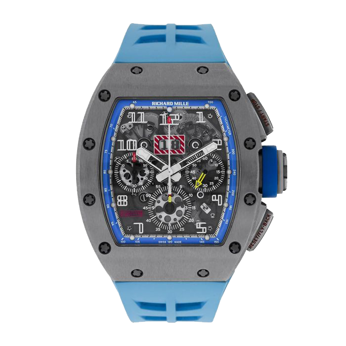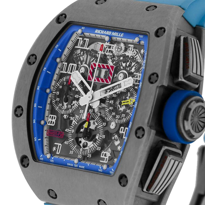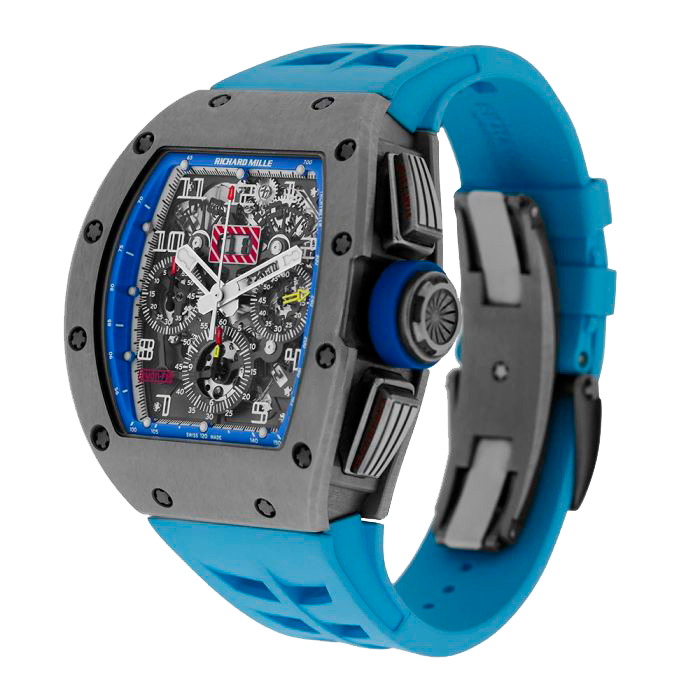 Richard Mille released a 30-piece limited edition of this exclusive blue timepiece of the Felipe Massa RM011 for the Americas market. The RM011 comes with a titanium, tonneau case that is 49.94 x 44.50 mm in dimensions and is assembled with 20 grade 5 titanium spline screws and abrasion resistant washers in 316L stainless steel. The dial is a transparent with three sub dials, an inner blue tachymeter bezel with a matching blue crown. The RM011 is powered by the RMAC1 Calibre which has automatic winding movement with adjustable rotor geometry and a 50-hour limit power reserve. The RMAC1 Calibre a flyback chronograph with 60-minute countdown timer, 12-hour totalizer, oversize date and month functionality. This limited edition RM011 is paired with a blue rubber bracelet featuring a titanium double fold-over clasp. It has a water resistance of 50 meters (164 feet).