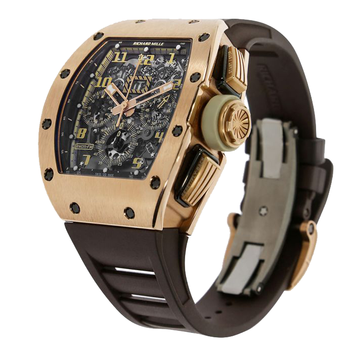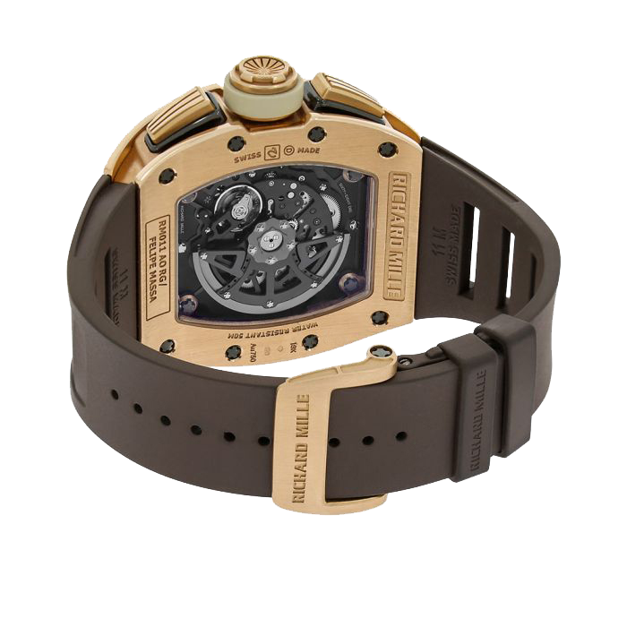 Richard Mille combined the beauty of animalistic ivory with luxurious rose gold for an RM011 that no one can resist. This RM-011 features a rose gold, tonneau case that is 49.94 x 44.50 mm in dimension and comes assembled with 20 grade 5 titanium spline screws and abrasion resistant washers in 316L stainless steel. The dial is skeletonized with ivory toned sub-dials and numerals as well as rose gold hands. The RM011 runs on the RMAC1 Calibre which has automatic winding movement with adjustable rotor geometry and a 50-hour limit power reserve. The RMAC1 Calibre offers hours, minutes, seconds, flyback chronograph, 60-minute countdown timer, 12-hour totalizer, oversize date and month. The transparent dial is skeletonized with Arabic numerals. This RM011 is paired with a brown rubber bracelet featuring a titanium fold-over clasp. It has a water resistance of 50 meters (164 feet).
