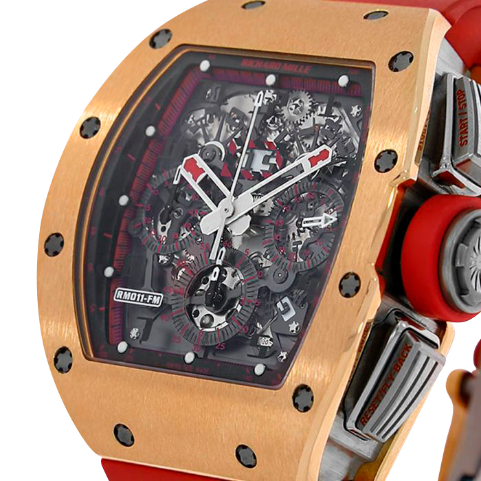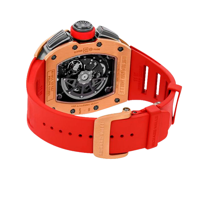 Take a different spin on what a demon can truly be when you own the Red Demon edition of the RM 011. It comes with a titanium, tonneau case with a rose gold bezel that measures 50mm x 42.7mm and is 13.95mm thick. The transparent dial features an anti-reflective sapphire crystal and case back and displays three sub-dials and a 12 oclock placed date feature. The entire case is fitted in scarlet red and black from the inner bezel to the sub-dials and everything in between. The visually striking case is fitted with a titanium caseband and crown, along with pushers set in NTPT carbon. It is powered by the RMAR1 Caliber that has skeletonized automatic movement with date functionality and a power reserve of up to 55 hours. this innovative watch comes with a declutchable rotor, that prevents the buildup of harmful debris inside the winding barrel and has a power reserve of up to 55 hours. It has a water resistance of 50 meters (164 feet). Only 30 pieces of the red demon edition were created so get yours while you can.