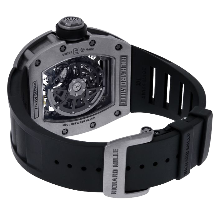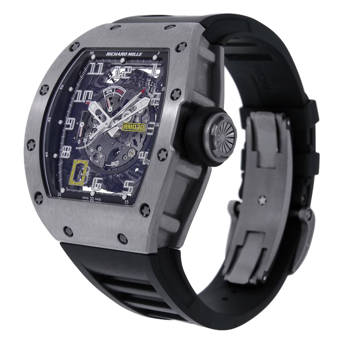 Ever the consummate perfectionist, Richard Mille aimed for peak design, when he created the RM 030 timepiece. An automatic watch with a declutchable rotor, that prevents the build-up of harmful debris inside the winding barrel. The titanium tonneau-shaped case is 42.7mm x 50 mm in dimensions and a sapphire crystal with 20 spline screws in grade 5 titanium. It comes equipped with the RMAR1 Caliber that has a skeletonized automatic movement with date functionality, a winding indicator, and adjustable rotor geometry. It has a power reserve of up to 55 hours. This innovative piece comes on a fabric strap with a fold-over clasp. It has a water resistance of 50 meters (196 feet).