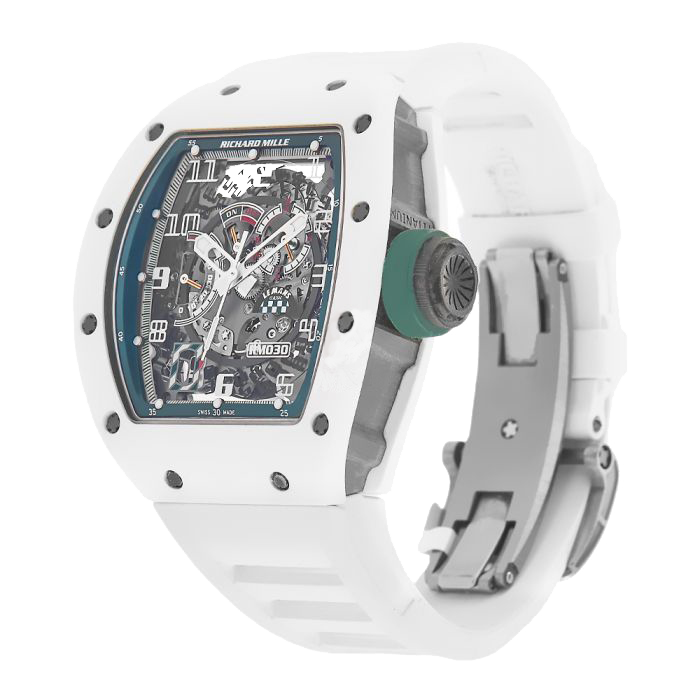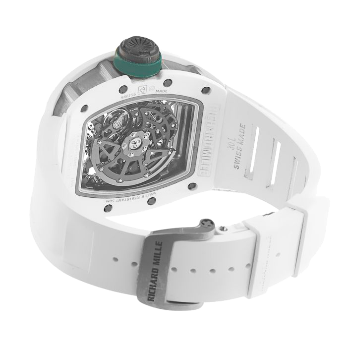 Limited to just 100 pieces worldwide. This is Richard Milles fourth tribute to the Le Mans Classic and as a sponsor of the race, the utmost care was taken in representing the brand and the race. This edition features a white ATZ ceramic case with grade 5 spline titanium screws, that is 50mm x 42.7mm and is 13.95mm thick. The transparent dial features an anti-reflective sapphire crystal and case back and comes in the colors of the historic race. The rubber of the crown features the forest green colors associated with the race. The dial features a power indicator, a 24-hour display, date and a lap timer. It is powered by the RMAR1 Caliber that has skeletonized automatic movement with date functionality, a winding indicator and adjustable rotor geometry. This innovative watch comes with a declutchable rotor, that prevents the buildup of harmful debris inside the winding barrel and has a power reserve of up to 55 hours. It has a water resistance of 50 meters (164 feet).