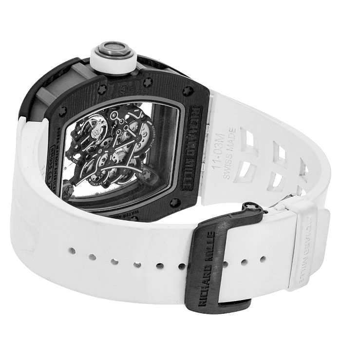 The RM 055 Bubba Watson is inspired by the RM 038 Bubba Watson tourbillon watch presented in 2011. Its mechanical movement, crafted in grade 5 titanium displays extreme skeletonisation. The RM 055 is a highly technical creation that is innovative, sporty and hand-finished in the finest watchmaking tradition. Powered by the RMUL2 Caliber, the White Legend RM055 features a power reserve of 55 hours ad features both a baseplace and bridges made of grade 5 titanium. Water resistant up to 30 meters or 98 feet.