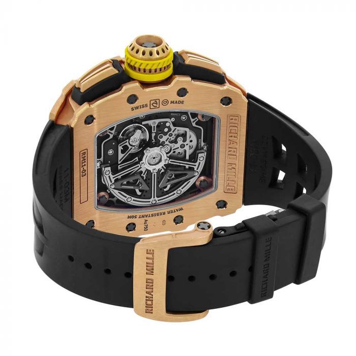 In honor of the New Zealander racing legend Bob McClaren, Richard Mille created the McClaren Collection. True to Richard Mille style, many of the details of the watch architecture and design are influenced by the automotive world from crown decorated with a wheel pattern, to pushers with pedal motifs and tire-tread strap. It comes in a rose gold case that measures 44.50 x 49.94 mm and a 16.15 mm thickness. It features the RMAC3 Calibre with automatic winding movement, offering analog time function, flyback chronograph, 60-minute countdown timer, and oversized date display. It has a skeletonized dial with raised hour markers for easy visibility. Thanks to two barrels, the watch offers 55 hours of power reserve. It has a black rubber bracelet with a titanium buckle. It has a water resistance of 50 meters.