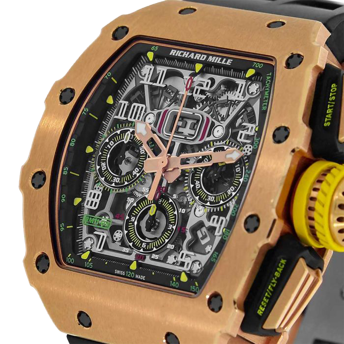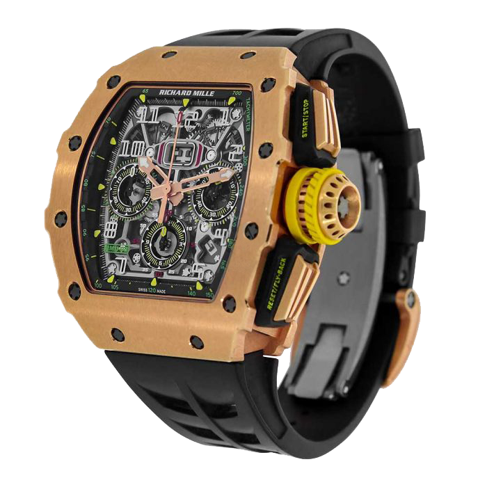 In honor of the New Zealander racing legend Bob McClaren, Richard Mille created the McClaren Collection. True to Richard Mille style, many of the details of the watch's architecture and design are influenced by the automotive world‚ from crown decorated with a wheel pattern, to pushers with pedal motifs and tire-tread strap. It comes in a rose gold case that measures 44.50 x 49.94 mm and a 16.15 mm thickness. It features the RMAC3 Caliber with automatic winding movement, offering analog time function, flyback chronograph, 60-minute countdown timer, and oversized date display. It has a skeletonized dial with raised hour markers for easy visibility. Thanks to two barrels, the watch offers 55 hours of power reserve. It has a black rubber bracelet with a titanium buckle. It has a water resistance of 50 meters.