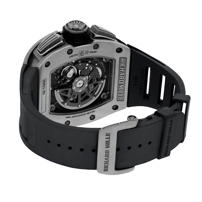In 2014 Richard Mille released the newest Richard Mille model RM 11-02 which forever changed the traditional Richard Mille, for the better. This edition of the RM11-02 comes with a titanium case which is tonneau shaped with 42.7mm x 50 mm dimensions and 16.15mm thick. It has a sapphire crystal and exhibition case back with a skeletonized dial. The RM11-02 case is further protected by spline screws in grade 5 titanium which better protect this high-powered timepiece. The RM11-02 dial is transparent and features three sub-dials, a date window, a month window and an additional superluminova-filled hand to indicate UTC or a second time zone. The RM11-02 is powered by the RMAC1 caliber with skeletonized automatic movement and includes chronograph, 60-minute countdown, 12-hour totalizer, date and month functionality with a power reserve of 55 hours. This innovative piece comes on a rubber strap with a titanium fold over clasp. It has a water resistance of 50 meters (196 feet). Alternative strap is available.
