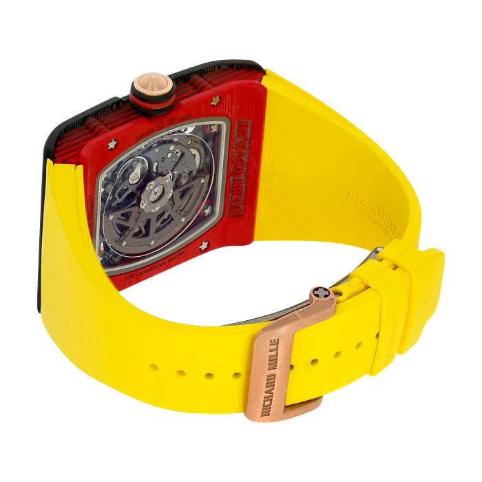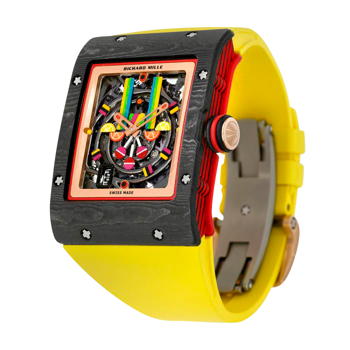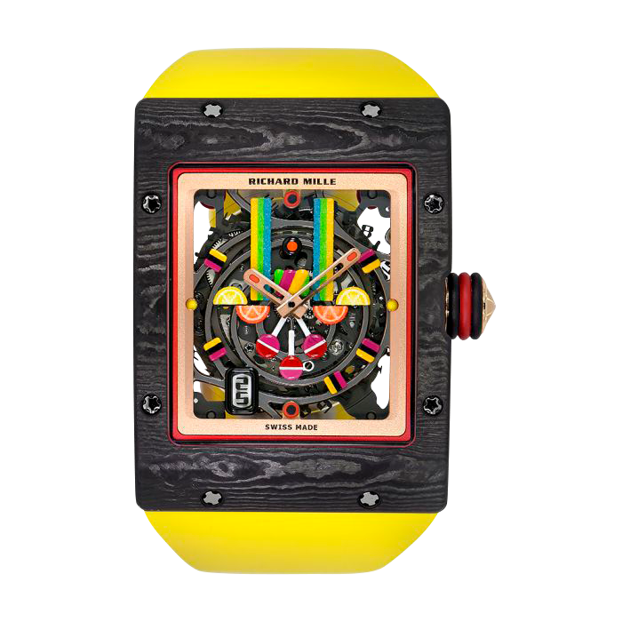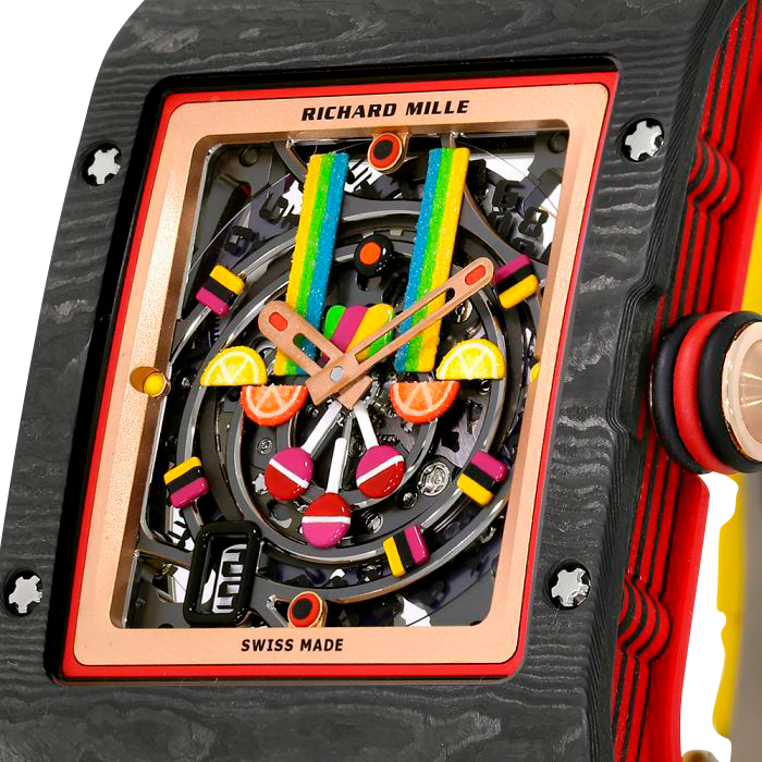 At 2019 SIHH, Richard Mille introduced its most playful collection, the Bonbon collection. The Bonbon collection is a 10 Richard Mille models with only 30 limited-pieces made of each model. The RM16-01 Fraise has a tonneau shaped case that is 50.2 x 38 mm in surface area and 9.88mm thick. The bezel is made of carbon TPT, the caseback is made of Red Quartz TPT and the caseband is a mix of the two materials to create a smooth transition between the two. It has a skeleton that dial is made of grade 5 titanium with grey titalyt treatment and features sublime candy pieces and a date window. The vibrant candy pieces are hand painted in acrylics and lacquer with an enamel sugaring effect to create a realism art pop design. The Richard Mille Fraise is powered by the self-winding RM16-01 caliber that has skeletonized movement with an adjustable geometry rotor, date functionality and a power reserve of 55 hours. The delectable case is paired with a yellow rubber bracelet with a double fold over titanium and rose gold closure. It has a water resistance of 30 meters (98 feet).