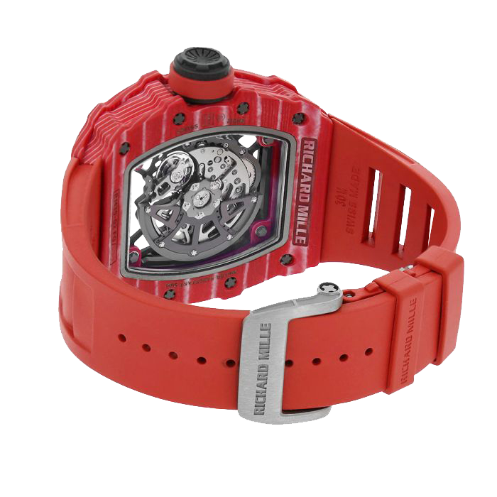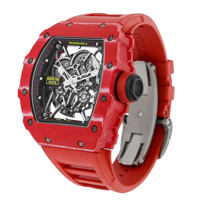 Inspired by the requests of their fans, Richard Mille created its first automatic watch in the Rafael Nadal Collection, the RM35-02. The tonneau case measures 44.5mm x 49.94 mm, is 13.15 mm thick and is made of Carbon TPT, a resin infused material that is specially developed for Richard Mille. The red Carbon of the RM35-02 surface displays extremely regular undulations, as they are composed of multiple layers of parallel filaments obtained by dividing carbon fibre or silica threads. The transparent sapphire crystal is treated with anti-reflective treatment on both sides for easy legibility. The RM35-02 runs on the Calibre RMAL1 with automatic winding skeletonized movement with hours, minutes, seconds and a power reserve of 55 hours. The skeletonized movement employs baseplate and bridges made of wet-sandblasted grade 5 titanium to ensure maximum rigidity and durability. It comes on a fabric strap with a velcro fastener. It has a water resistance of up to 50 meters (164 feet).