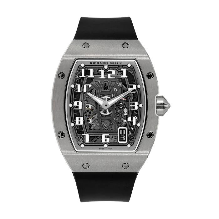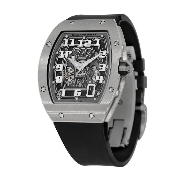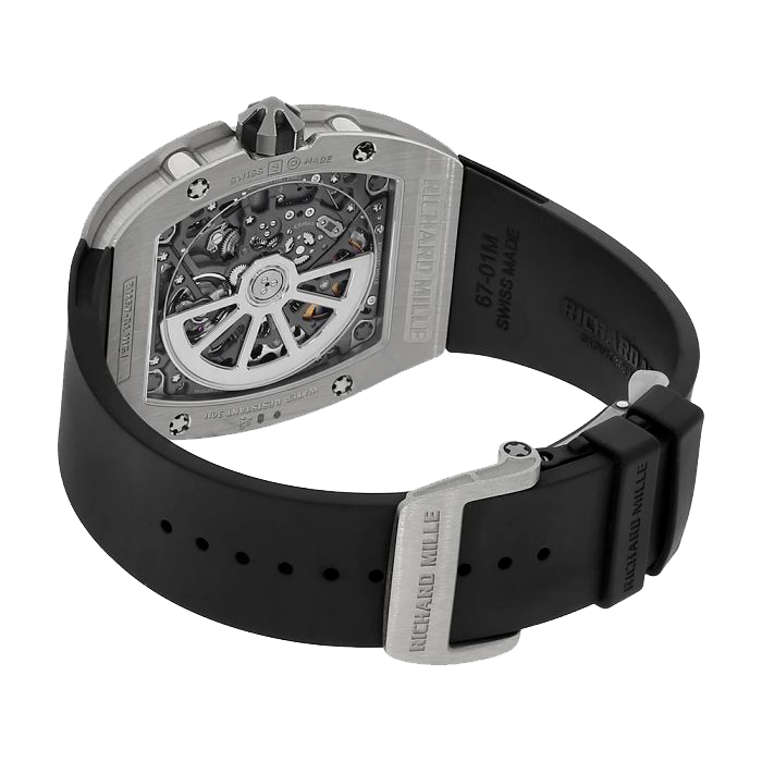Richard Mille further pushes the brilliance of the RM67-01 by creating a titanium version of the beloved lightweight timepiece. The RM67-01 is a flatter timepiece than the typical Richard Mille timepiece and is the perfect luxury watch that won't weigh you down. The watch has a titanium tonneau-shaped case that is 47.52 x 38.7 mm in dimension and 7.75mm thick. It comes in an extra flat form meticulously created with 8 different stamping operations for the bezel, case band, and back bezel. The RM67-01 has a skeletonized dial with baseplate and bridges in micro-blasted grade 5 titanium and a function indicator on the dial that shows winding, date setting, and hand setting positions as the crown is pulled out. The RM67-01 is powered by the CRMA6 caliber which has automatic skeletonized winding movement, date functionality, a function indicator, and a 50-hour power reserve. It is paired with a rubber bracelet that has a titanium fold-over bracelet. It has a water resistance of 50 meters (164 feet).