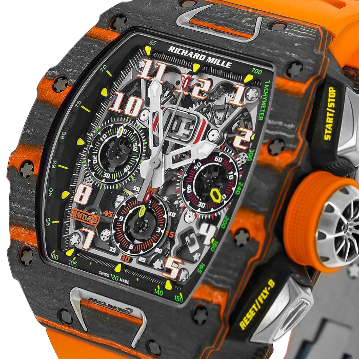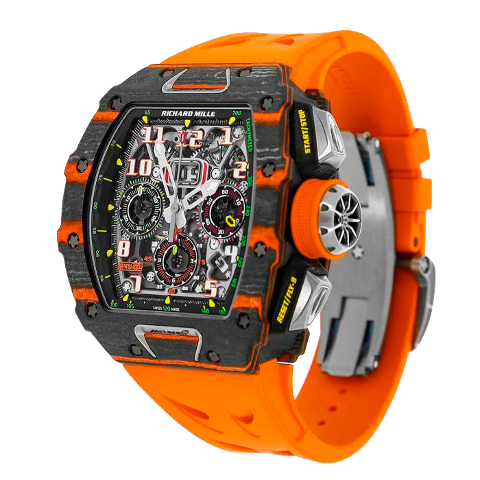 This RM11-03 is the first collaboration between McLaren Automotive and Richard Mille introduced at the 2018 Geneva International Motor Show. Limited to 500 pieces made, this timepiece incorporates more Formula 1 technologies than any other Richard Mille had before making it a marvel of horological technology. The Mclaren RM11-03 is made of carbon TPT and orange quartz TPT creating an appearance unique to each of the individual 500 pieces made. The case is tonneau shaped and is 49.94 x 44.50 mm in surface area and 16.23mm thick with titanium crown and pushers and titanium inserts that resemble the iconic McLaren F1’s air-intake snorkel. The dial is skeletonized with three sub-dials, raised Arabic numerals, a tachymeter on the inner bezel, month display between 4 and 5 o-clock.and a date window at 12-o-clock. The RM11-03 is powered by the self-winding RMAC3 Calibre with a flyback chronograph, 60-minute countdown timer, oversized date display and a power reserve of 55 hours. It is paired with an orange rubber bracelet with a double fold-over titanium clasp. It has a water resistance of 50 meters (164 feet).